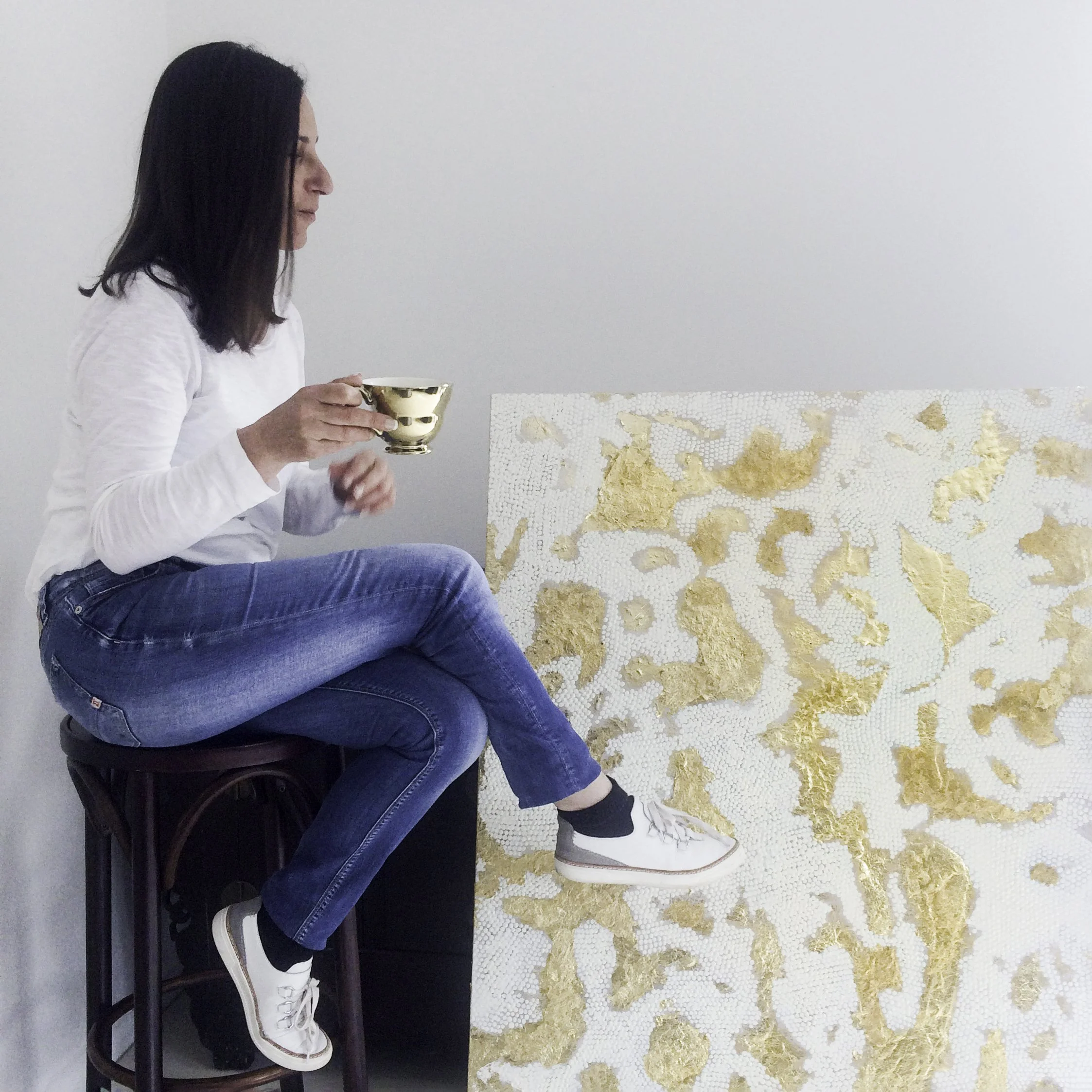 Acrylic paint is infused with gold, silver and copper leafing to create a luxurious finish that brings my paintings to life.